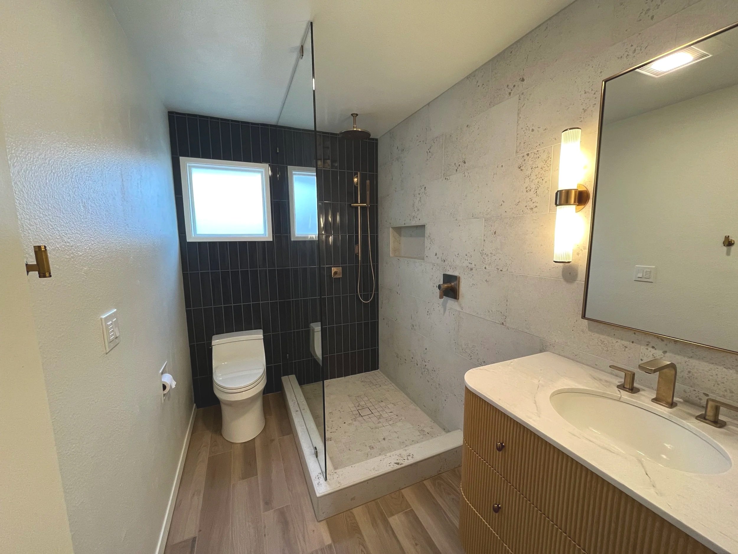 [ OVERVIEW ]This Eastmoreland bathroom remodel revitalized a dark, outdated space, infusing it with light and a sense of openness. The client wanted a fresh, modern look, so we added a new window for natural light, expansive wall tiles, and a sleek glass shower panel, all bringing a sense of airiness.