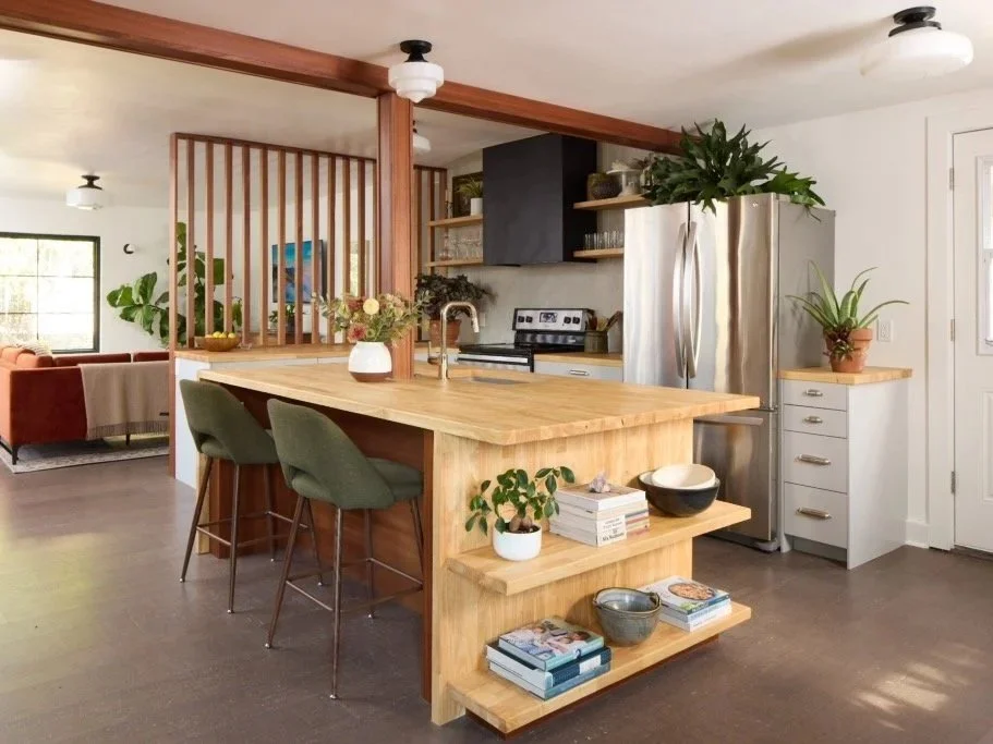 We removed walls to expand the layout, added a large island to anchor the kitchen, and installed all new custom cabinetry, flooring, and paint. We also removed the outdated popcorn ceiling and added wood slats as a stylish divider between the kitchen and living room. The result is a bright, open, and inviting kitchen that flows effortlessly with the rest of the home.
